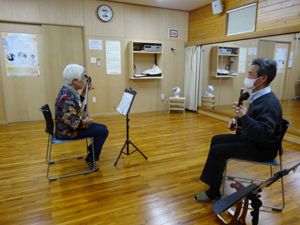 建物の中には壁の一面が鏡張りで、防音対策が施された20畳ほどの部屋が一室。ここで週3日ほど、夕方に三線教室を開いている。三線教室は、沖縄・奄美地方に伝統の、三線を奏でながら唄う、いわゆる弾き語りの教室である。現在25人いる生徒さんの年代は、下は小学2年生から上は80代のマダムまでと幅広い。地元の人もいれば、教員や病院の看護師などの“転勤族”もいる。親子で通う人もいる。中でも多いのは中高年女性だ。50代が7人、60代が6人、70代が4人。週1回~月2回ほどの個人レッスンを心待ちにして通ってきている。