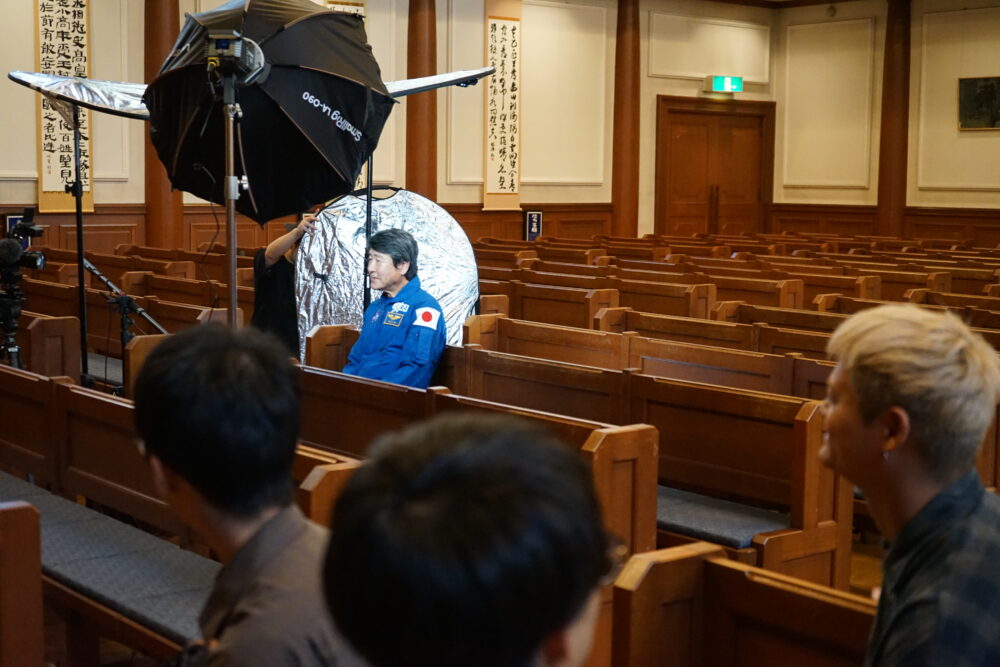 9月某日、深草キャンパスにある礼拝施設、顕真館にて「VOiCE」の撮影が行われました。土井さんは宇宙飛行士が訓練で使用するブルースーツを身にまとい悩みに答えていきます。学生たちもその様子を真剣な眼差しで見つめていました。