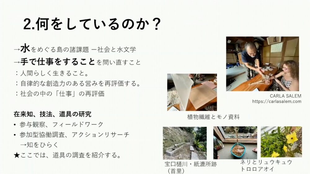 このような文化とコミュニティづくりをめぐる課題に対して、最近取り組んでいるテーマは大きく2つがあります。一つは水と社会との関わり、そしてもう一つは手で仕事をすることです。今日は後者の取り組みを紹介したいと思います。私は、その土地の人たちが育んできた在来の知識、つまり在来知と、技法、道具に関する記憶を、地域の方と共に掘り起こすアクションリサーチをおこなっています。ソーシャル・イノベーションを考えるにあたり、アクションリサーチは重要な手法になってくるのではないかと思います。
