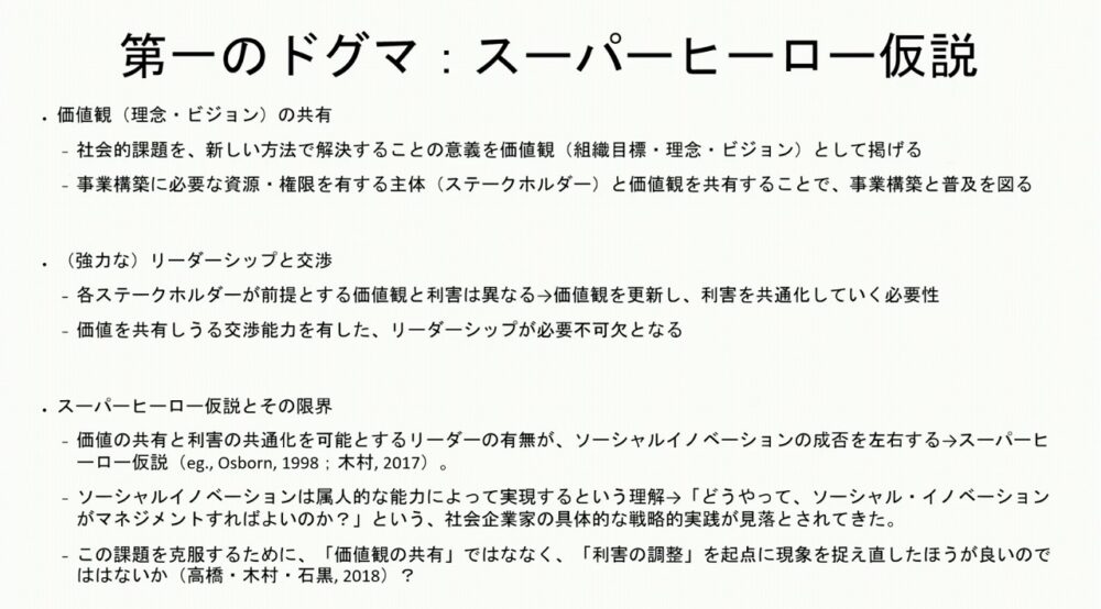 私たちは『このプロセスモデルには行き詰まりを産んでいるのでは』と考え、研究をスタートさせました。(プロセスモデルの行き詰まりを産み出す)第一のドグマを『スーパーヒーロー仮説』としています。これは、社会的課題を発見し、ビジネスプランを構想したうえで銀行や投資家から資金を集め、仲間を募り、製品やサービスを売り込む、さらに行政とも連携する……こうしたすべての役割をこなせる万能な人材を前提としているという問題です。入澤理事長の基調講演で『人をどう育てるか』というお話がありましたが、“このようなスーパーマン”を育てようとした時点で、計画は頓挫する可能性が高いです。価値観を共有したいという前提のもとでは、知らず知らずのうちにその価値観を他者に押し付けていることもあります。価値観の共有ではなく、利害の調整を起点にして現象を捉え直した方が良いのではないかと考えます。