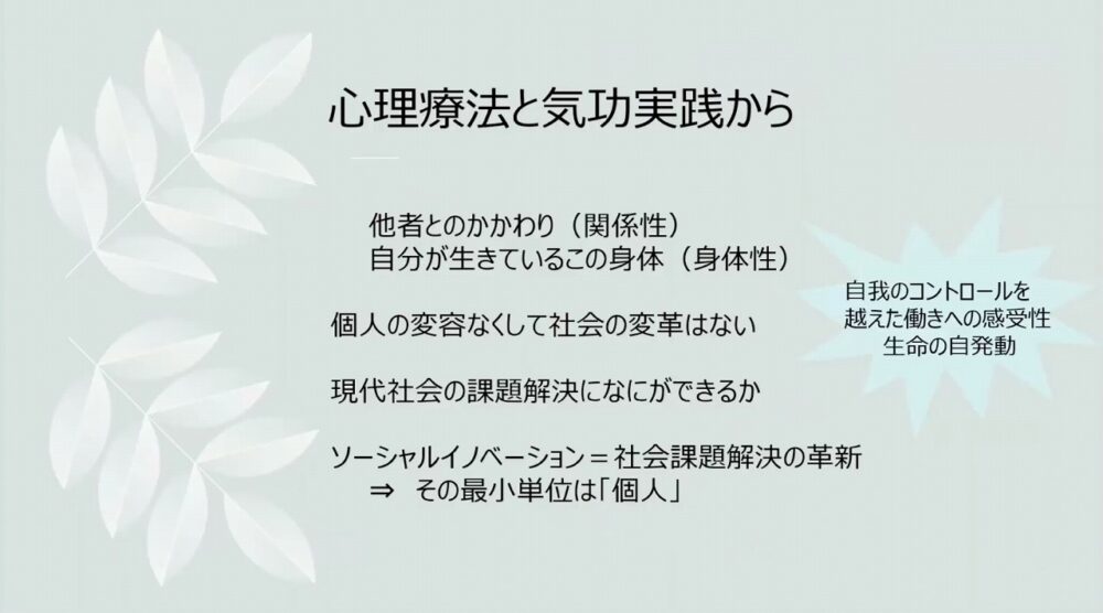 「私の専門は臨床心理学で、個人の心の悩みについて研究しています。心と体の繋がりは大切ですので、私自身、長年にわたり気功を続けています。自分の体と付き合い、それを臨床にどう活かすことができるかということにも取り組んでいます。