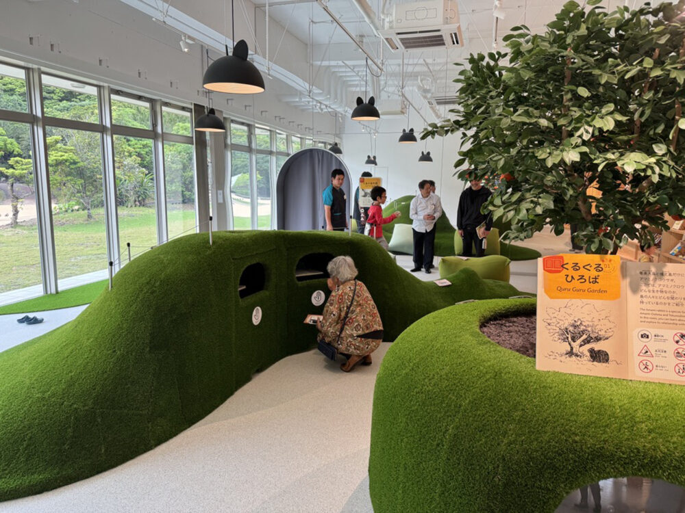 QuruGuruは①ぐるぐるひろば②ぐるぐるの森③「ひるにわ」(屋外飼育場)④「よるにわ」(屋内飼育場)―と4つの展示室があります。ひろばはクロウサギの世界への導入部分です。図書やアニメ、大和小中学校にあった飼育小屋のジオラマなど多様なコンテンツを備えています。ひろばを抜けると、「くるぐるの森」に出ます。ここではクロウサギになった感覚で夜の森を疑似体験できます。スクリーンにはクロウサギが直面するロードキルなども映し出されています。