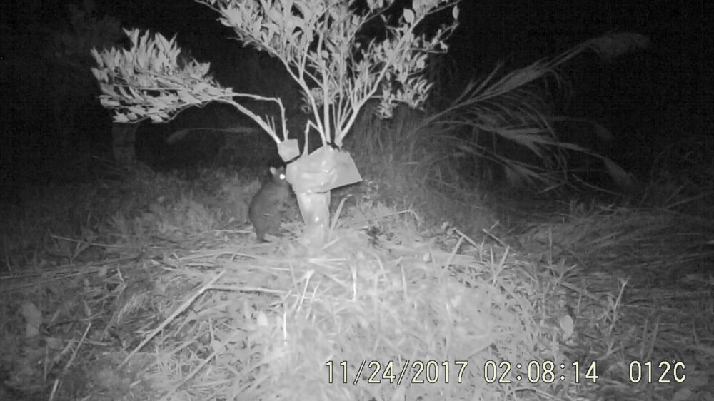 タンカンの樹皮をかじるクロウサギ(環境省奄美群島国立公園管理事務所・鈴木真理子さん提供)