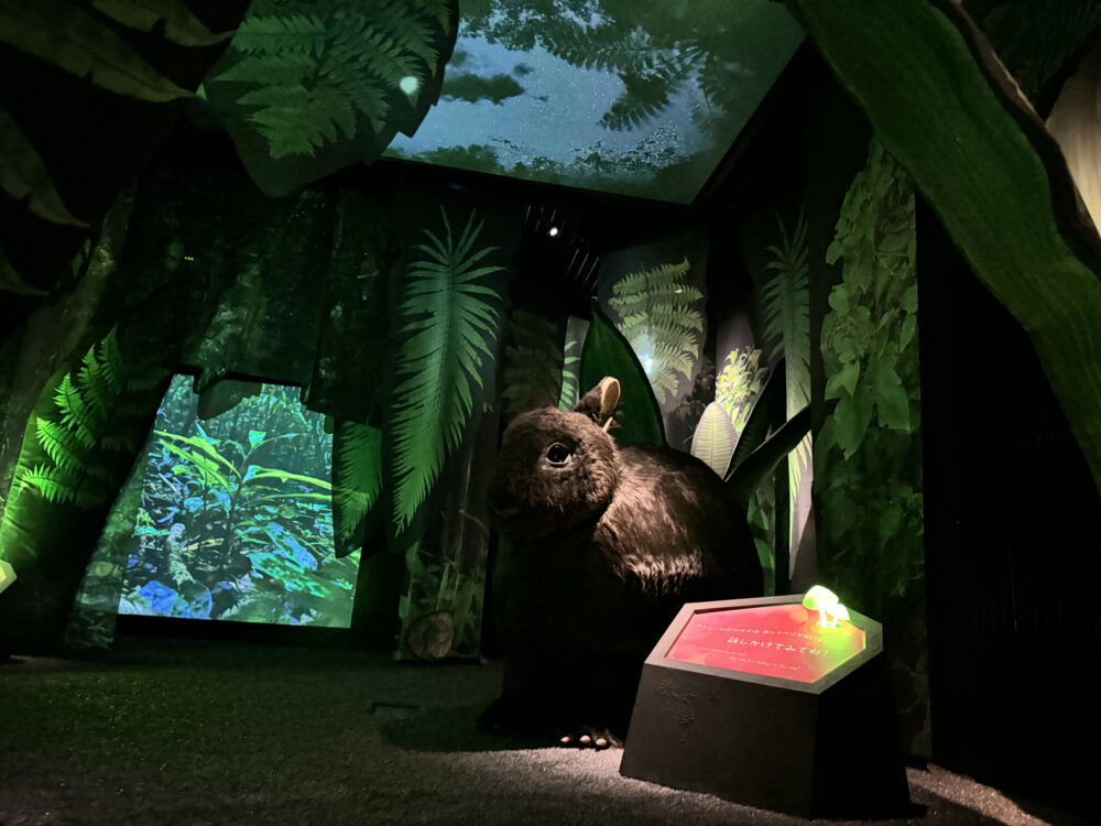 「くるぐるひろば」はクロウサギの生態や太古からの人とのつながりを紹介するコーナーです。「くるぐるの森」はクロウサギになった感覚で夜の森を体験できます。ここではクロウサギが直面する危機(ロードキル)の怖さも実感できます。